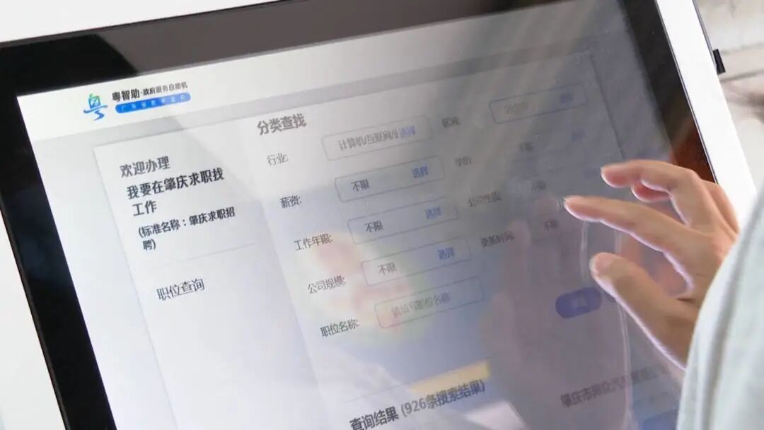 在四会市下茆镇,记者通过“粤智助”政府服务自助机体验了一把“家门口”的自助求职,与传统的线上查询、现场招聘等方式相比,“粤智助”招聘求职提供了快速便捷的查询渠道。