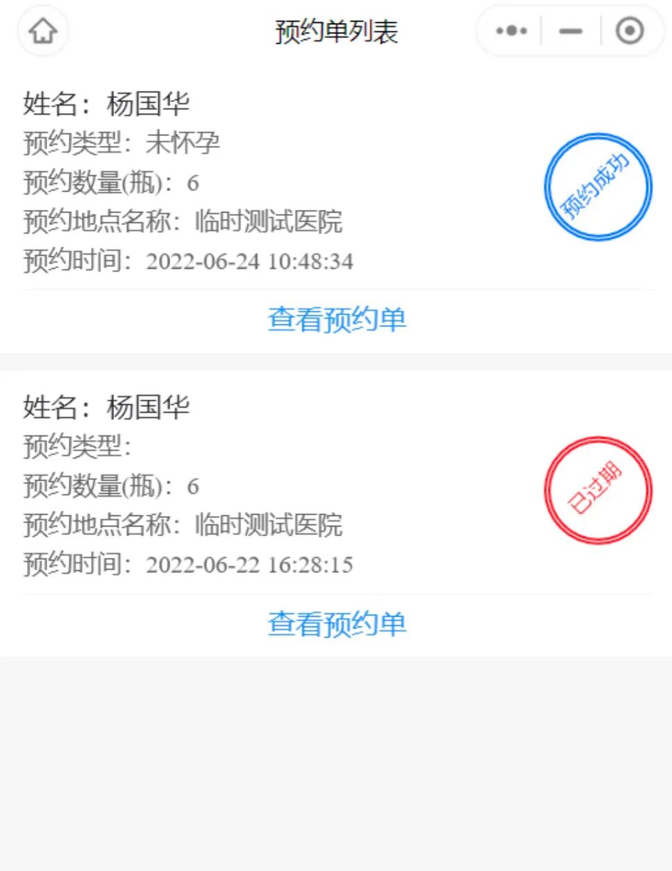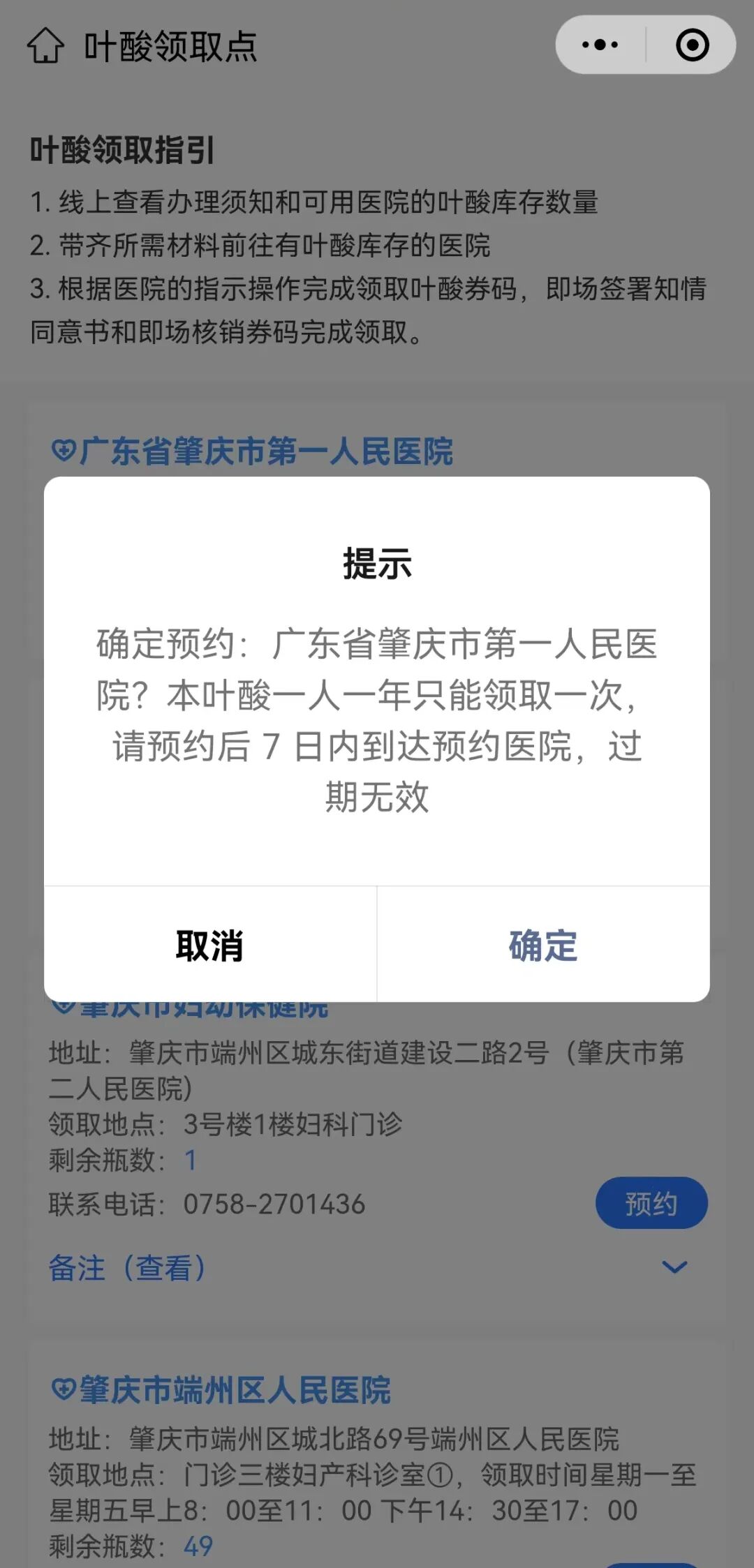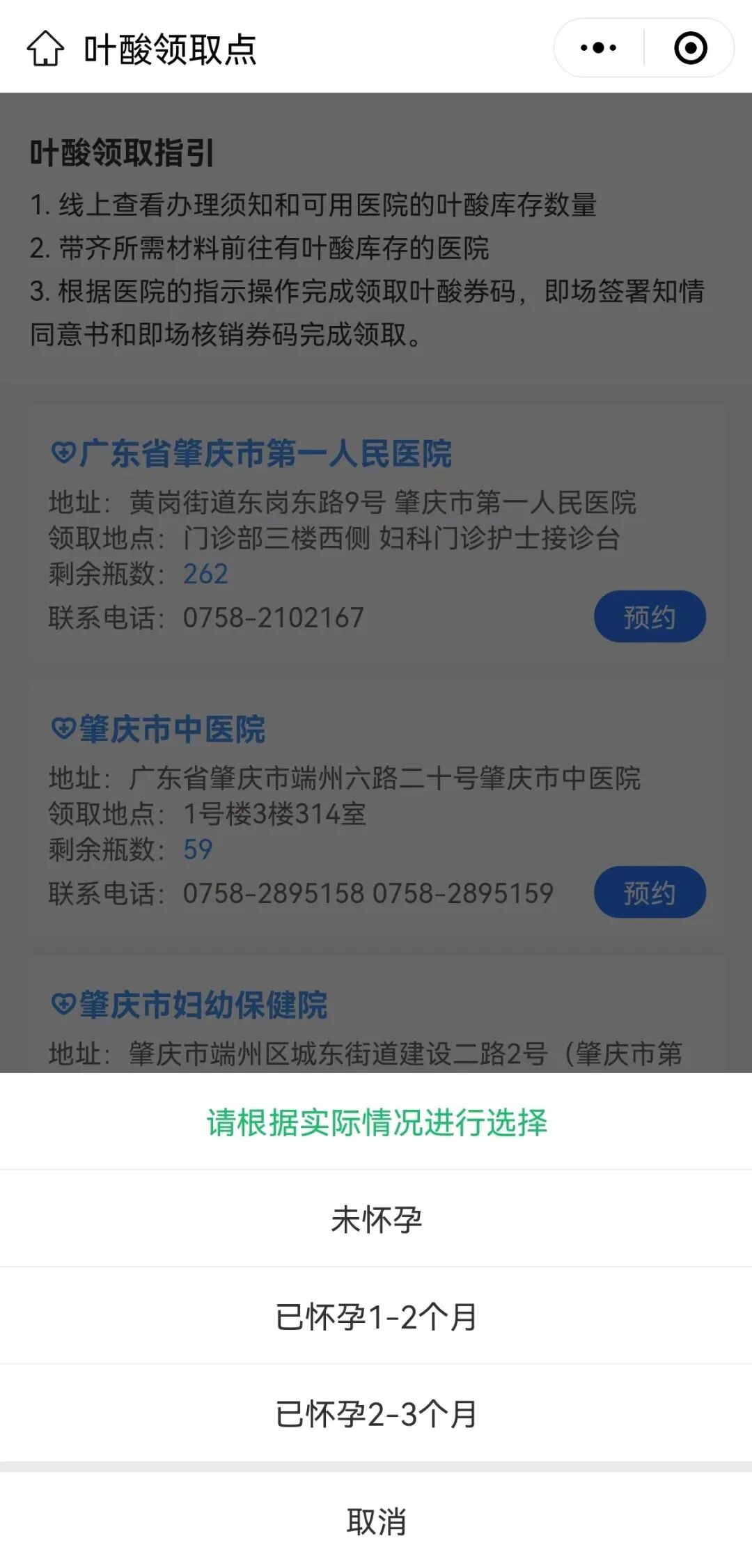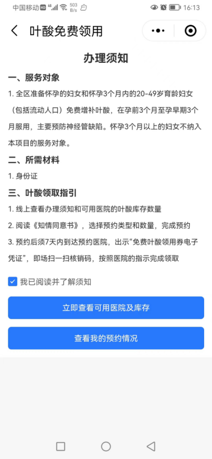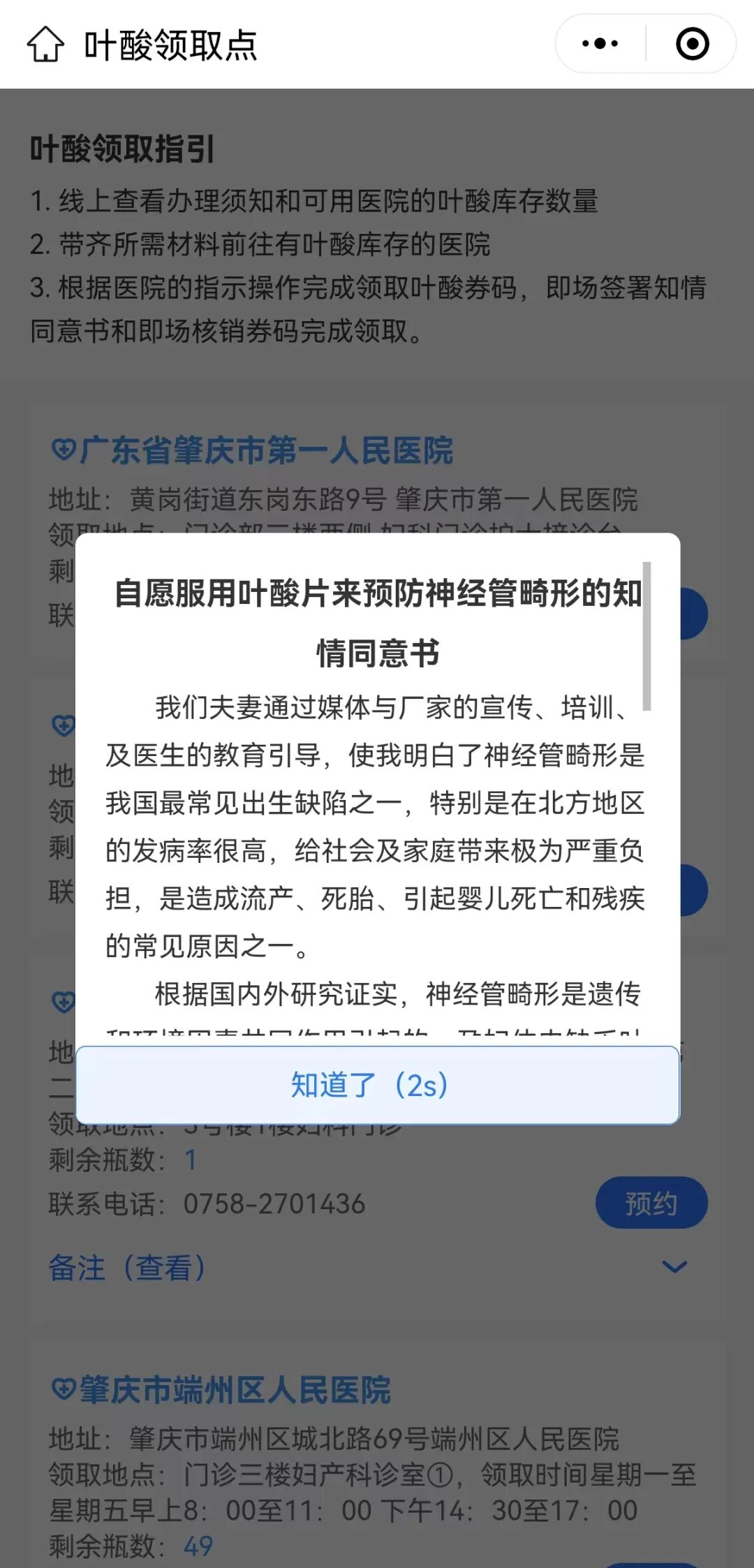 2.进入预约页面后需先查看办理须知,然后勾选“我已阅读并了解须知”,点击“立即查看可用医院及库存”按钮,选择要领取叶酸的医院,点击“预约”按钮,查看《知情同意书》,并根据自身情况选择预约类型,最后完成预约(备注:群众需在7天内到定点医院领取叶酸,过期无效,截图无效)。