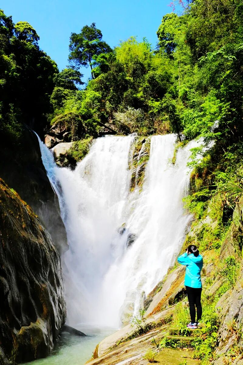沿着蜿蜒曲折的山路行进深去,我们还邂逅了长达1200米的“瀑布画廊”,共有桫椤瀑、叠泉瀑、螺旋瀑、隐龟瀑等20多个形态各异的瀑布。从瀑布喷溅出来的小水珠细如烟尘,弥漫于空气之中,成了蒙蒙水雾,给山涧林木披上了一层薄薄的轻纱。徒步其中,如同人在画中游,高含量的负氧离子令人神清气爽。