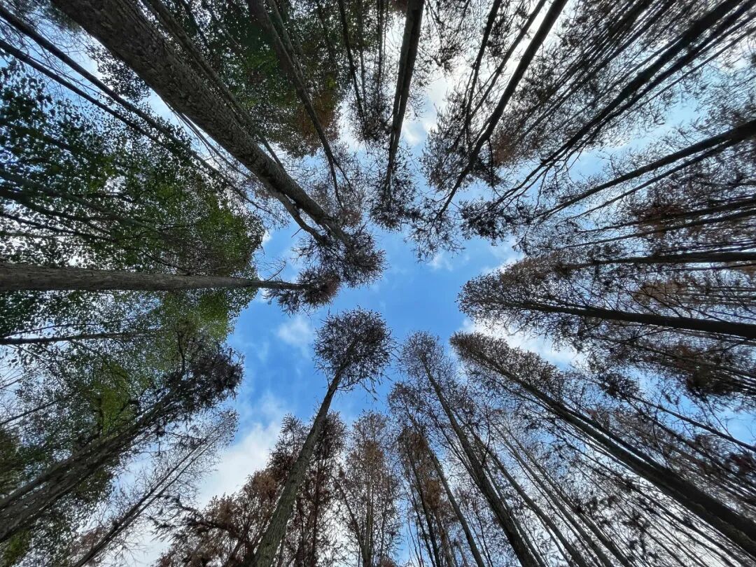 穿行在林间栈道,与两旁的落羽杉一一照面,欣赏它们挺拔而又各异的身姿,与同样穿林而来的微风撞了个满怀,不仅能感受到落羽杉独有的清香,还能让惯于喧嚣的身心沉浸在窸窣的枝叶摩挲声中,一洗尘杂。