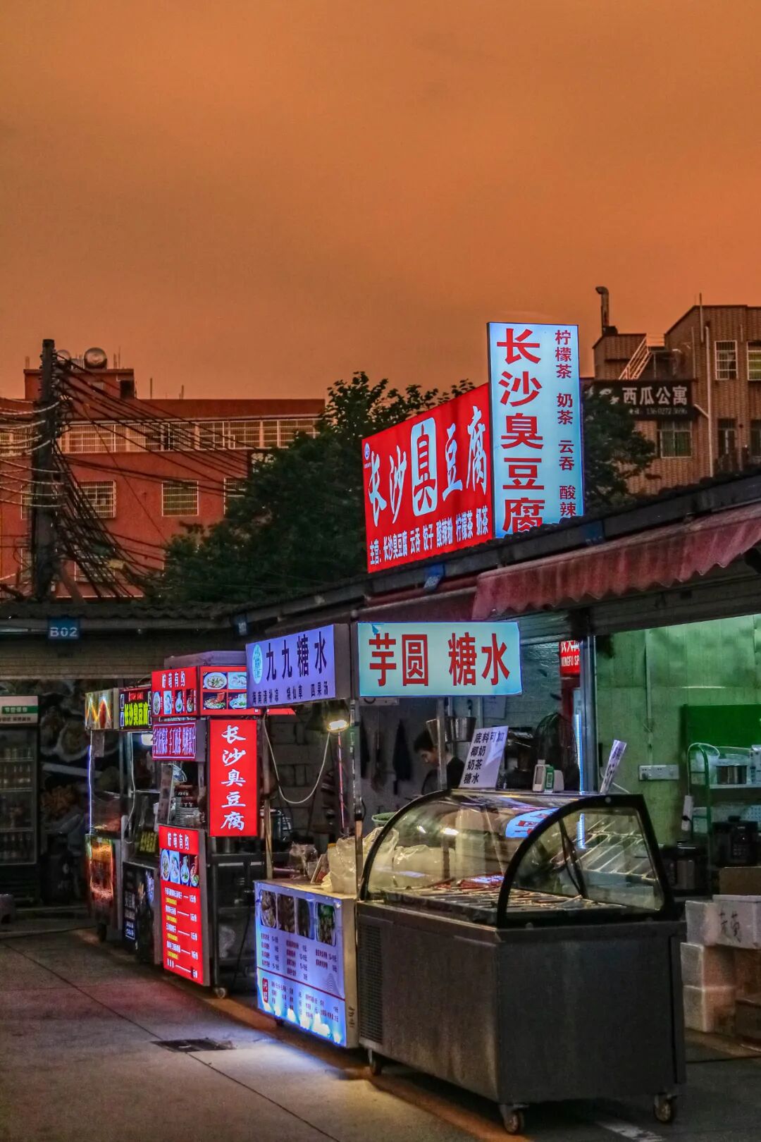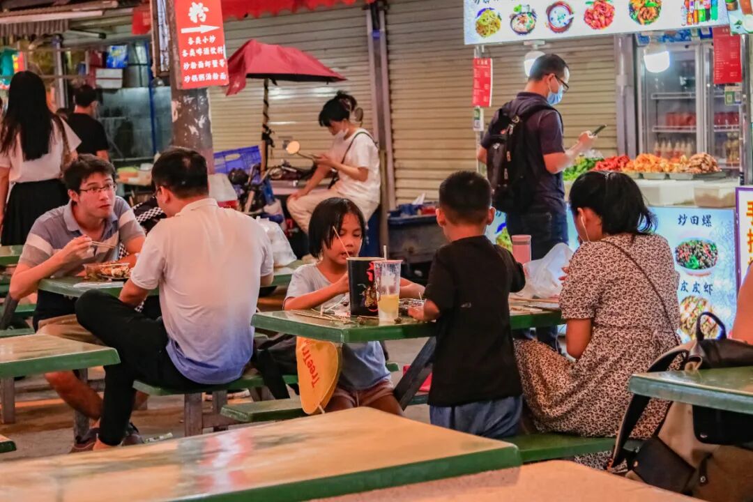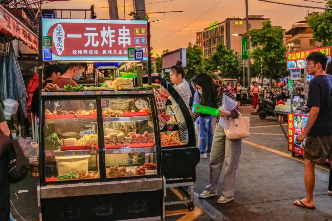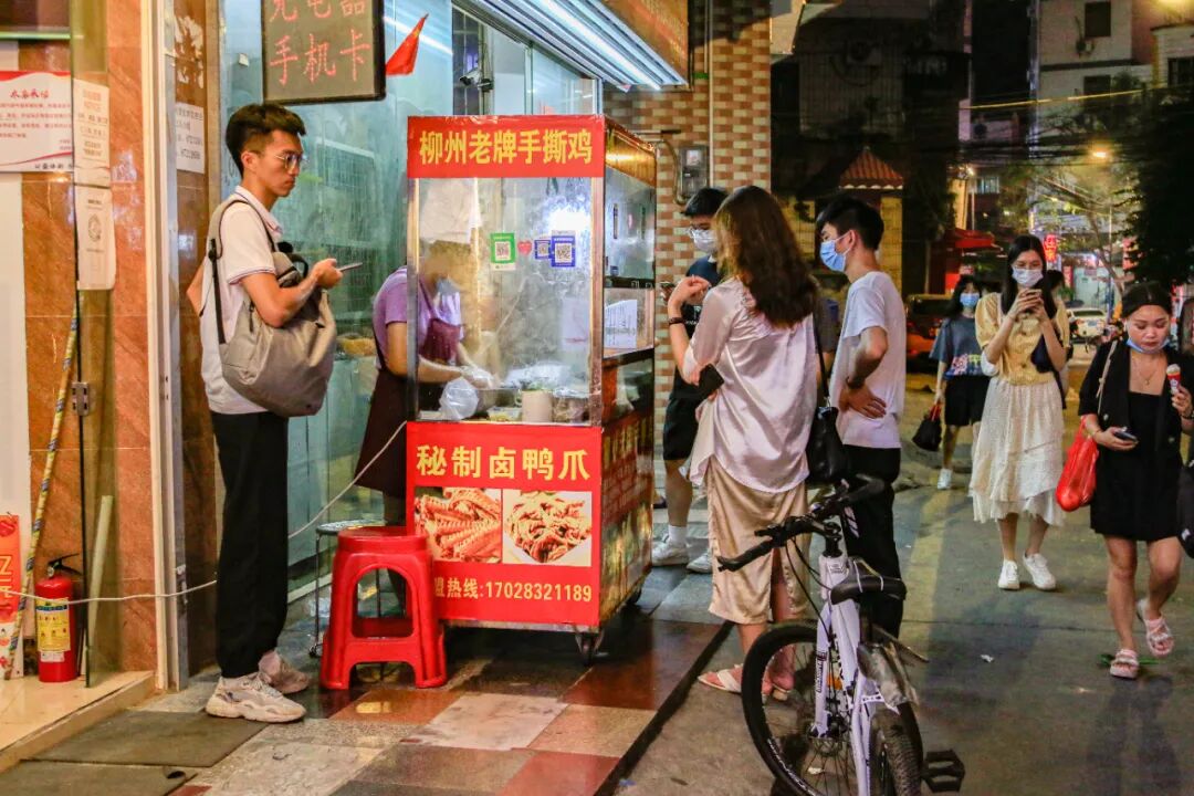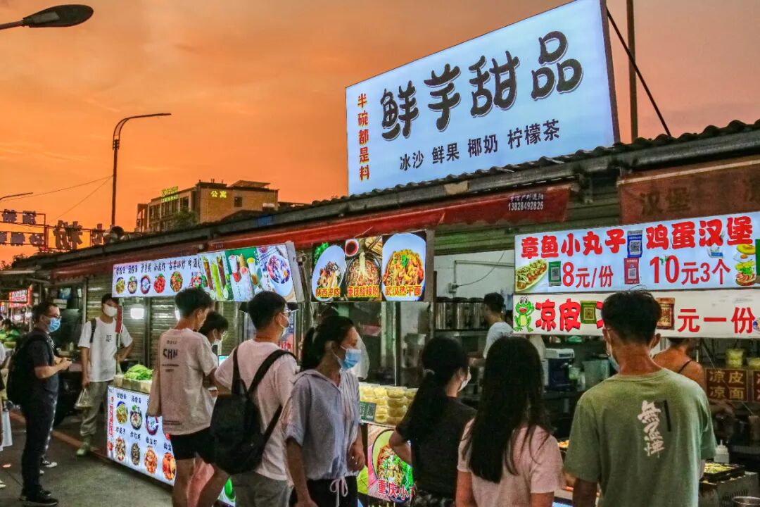 位于地铁站A出口的小吃街,烟火缭绕,异常夺目。海鲜、炒粉、猪脚饭、甜品、锅盔、串串、卤货……丛簇的小摊,犹如一个低配版的美食城。
