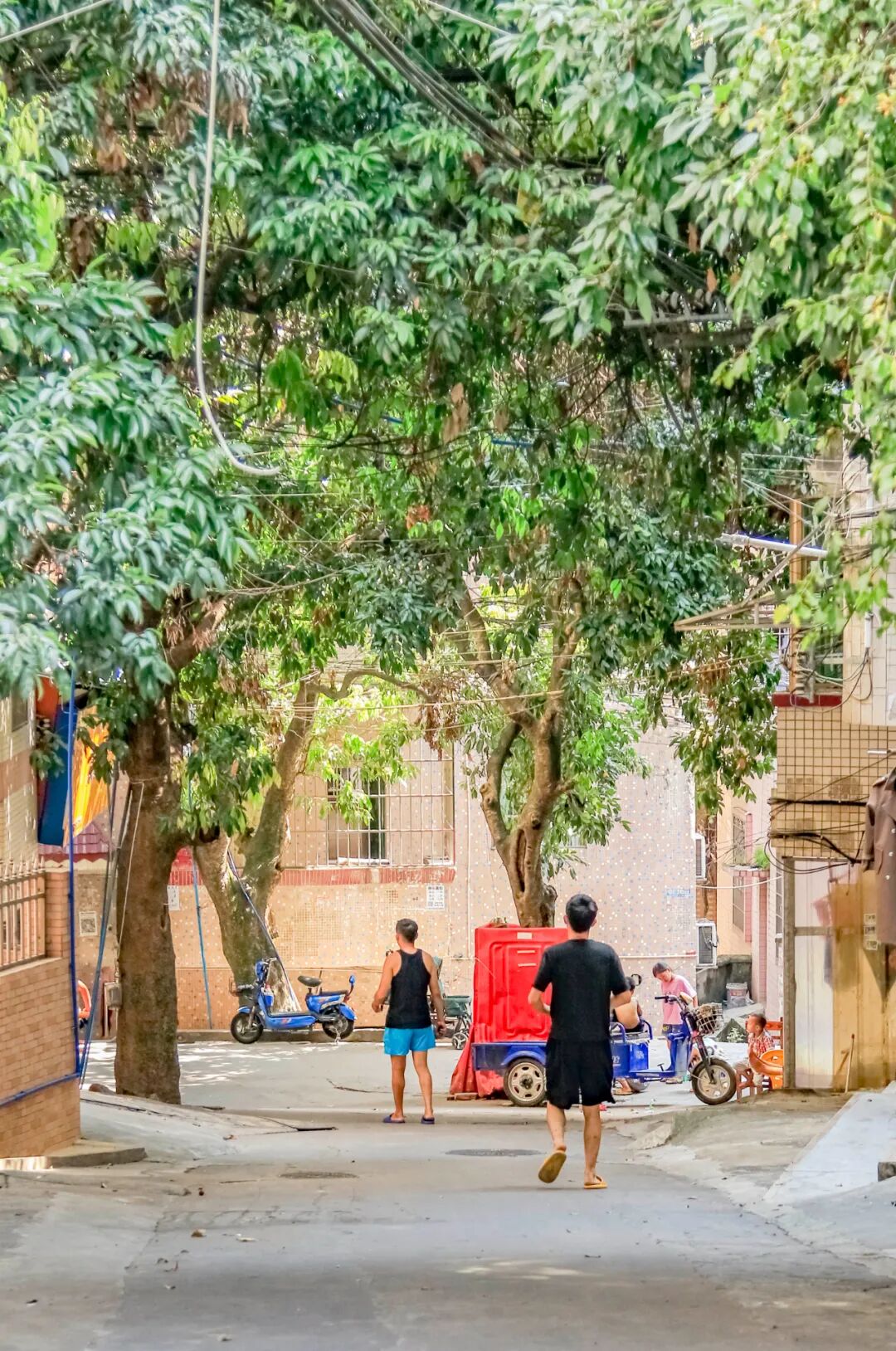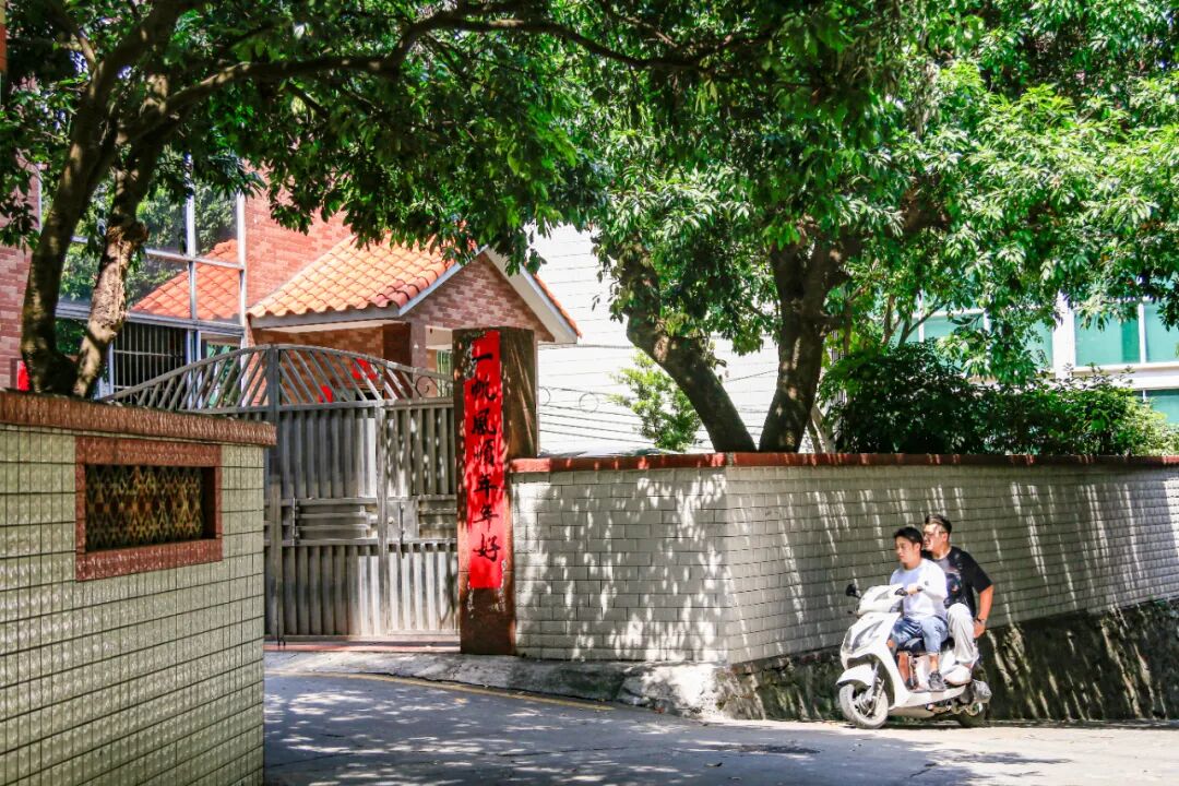 几株粗壮的荔枝树长在路边,果实累累,绿荫之下是啜着茶水、乘凉瘫坐或打桥牌的村民们,一派和谐。