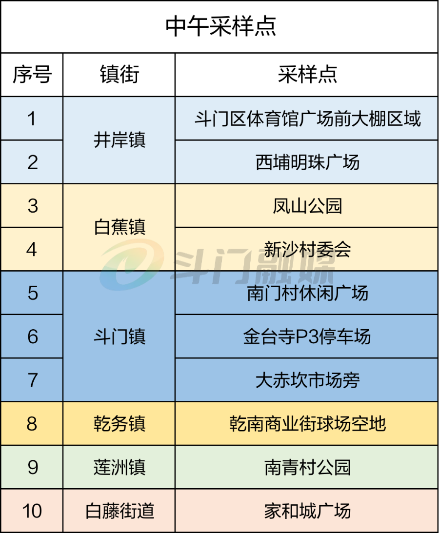 据了解,8月9日,斗门区共设10个中午采样点,覆盖五镇一街,市民在12:00-15:00均可前往接受采样。