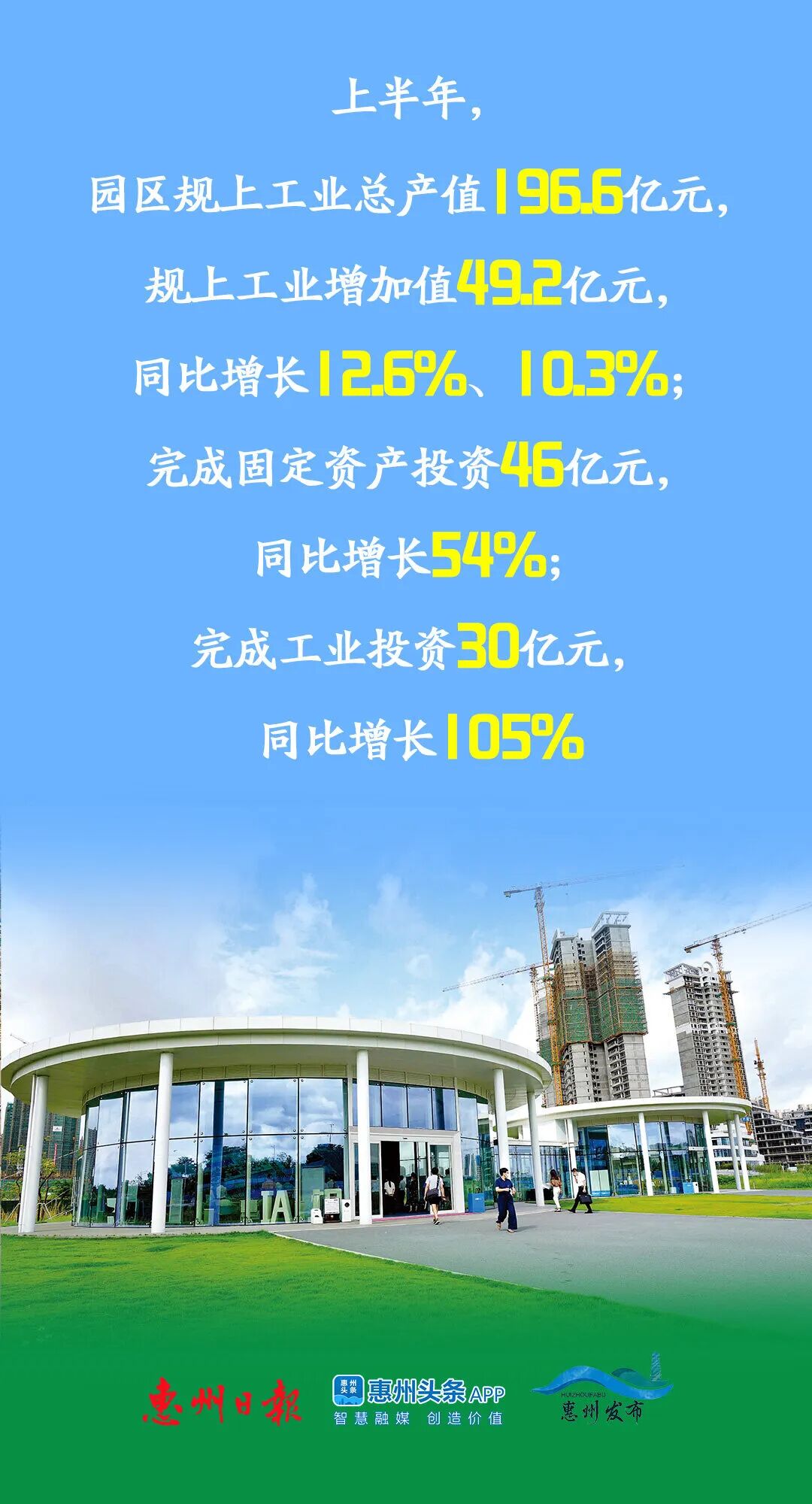 2022年上半年园区规上工业总产值196.6亿元,规上工业增加值49.2亿元,分别同比增长12.6%、10.3%;完成固定资产投资46亿元,同比增长54%;完成工业投资30亿元,同比增长105%。根据计划,到2025年,惠城区高新科技产业园力争产值达到1200亿元。
