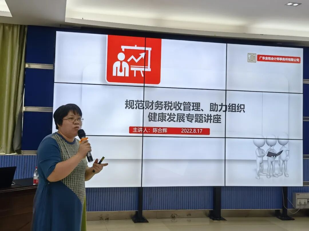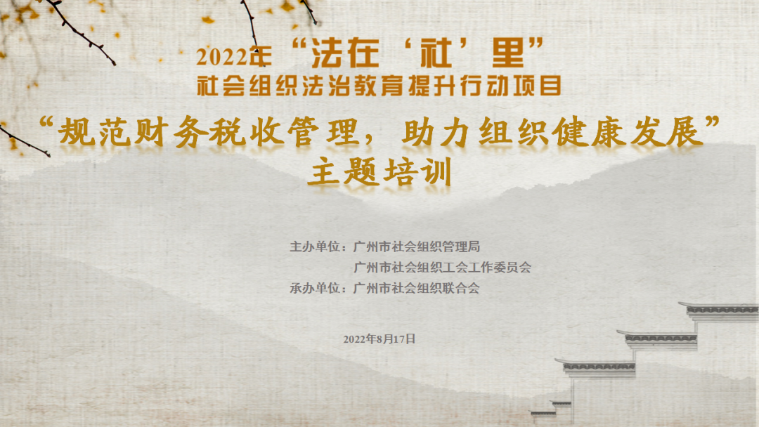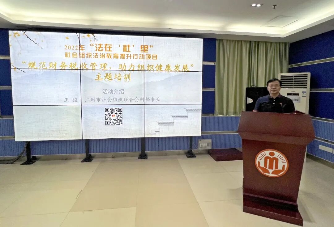 2022年8月17日下午,由广州市社会组织管理局、广州市社会组织工会工作委员会联合主办,广州市社会组织联合会(以下简称广州社联)承办的2022年“法在‘社’里”社会组织法治教育提升系列活动之“规范财务税收管理,助力组织健康发展”主题培训,在广州市社会组织培育基地9楼会议室举办,广州市社会组织管理局三级主任科员蓝卉参加活动。活动由广州社联副秘书长王俊主持,全市38家社会组织代表参加培训。