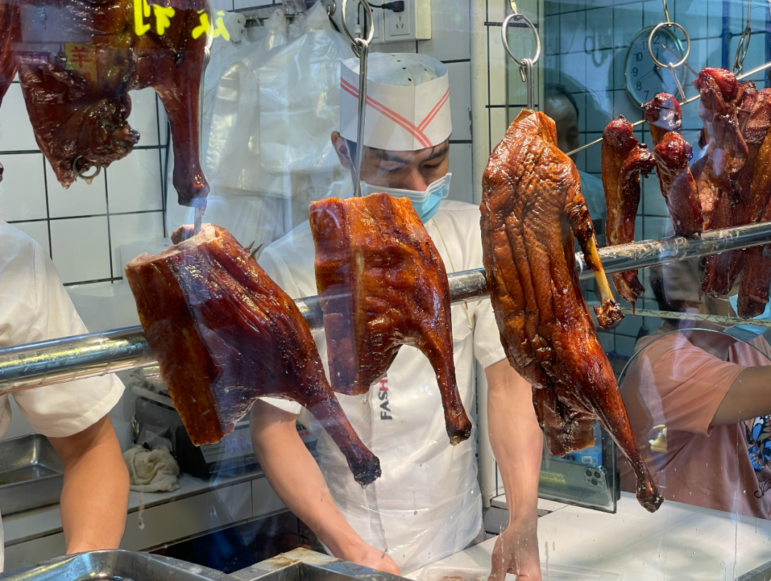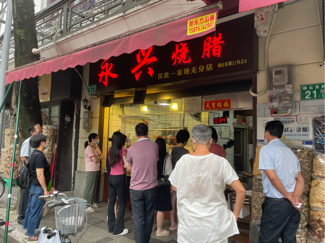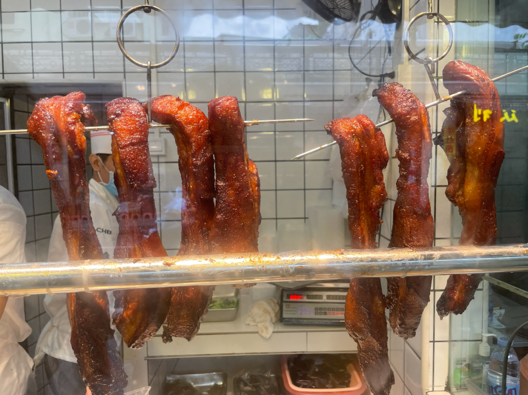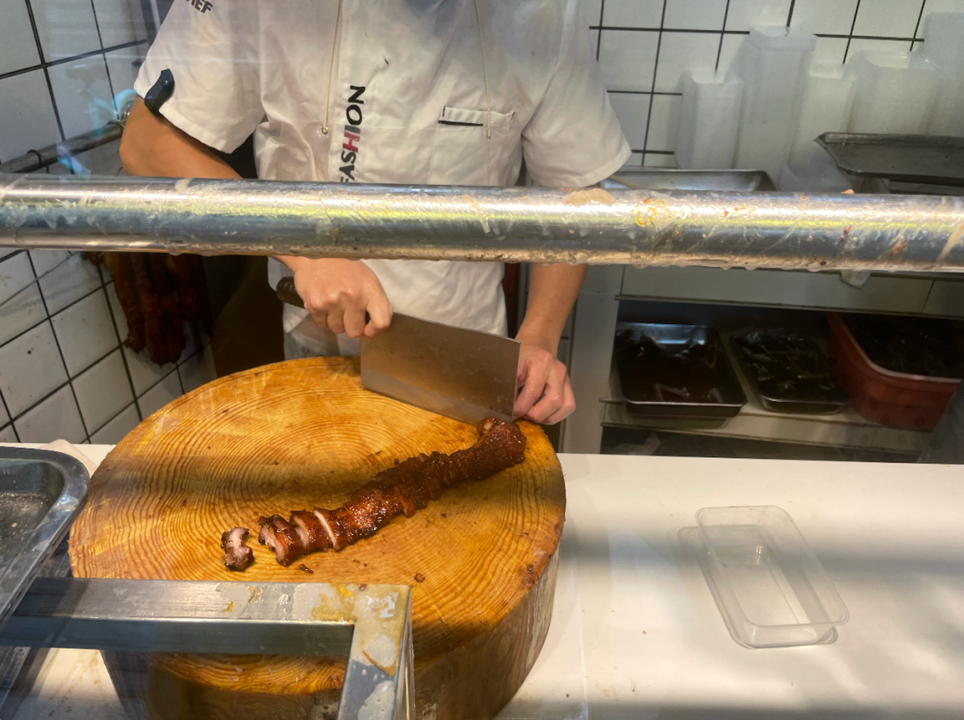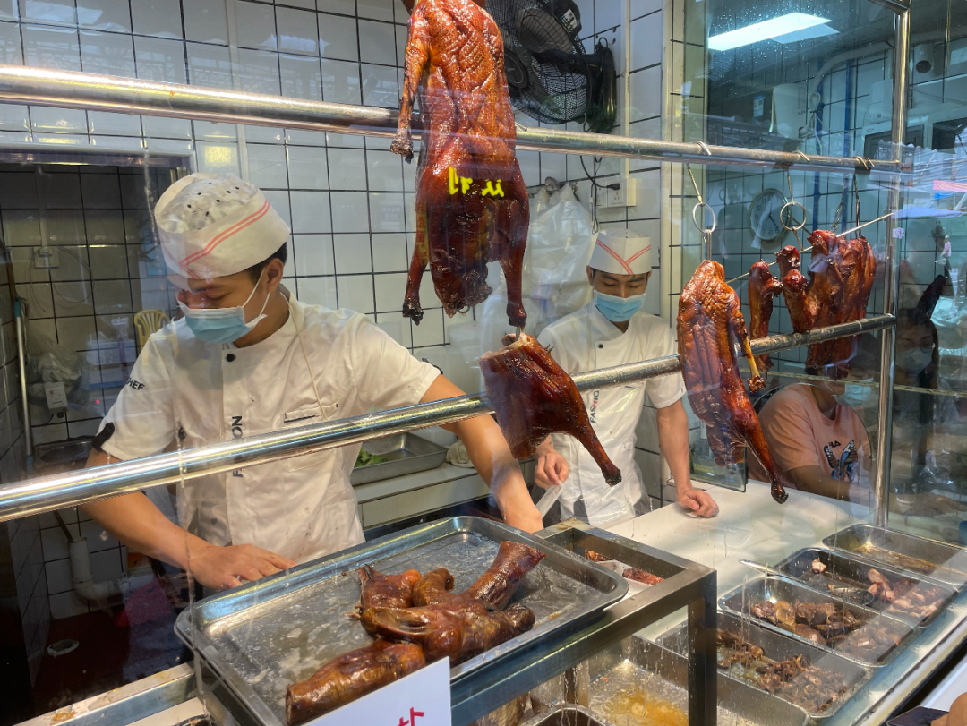 位于荔湾区梯云东路的永兴烧腊店,于1981年开店,至今已陪伴街坊40多年时间,是广州烧腊界的“老字号”。每天早晨10时,距离开门还有半个多小时,烧腊店门前已经挤满了排队拿号的街坊。随着卷帘门被拉开,玻璃橱窗后面挂着一排排通红透亮的蜜汁叉烧、皮脆油亮的烧鹅烧鸭,顿时香气四溢,引人垂涎。