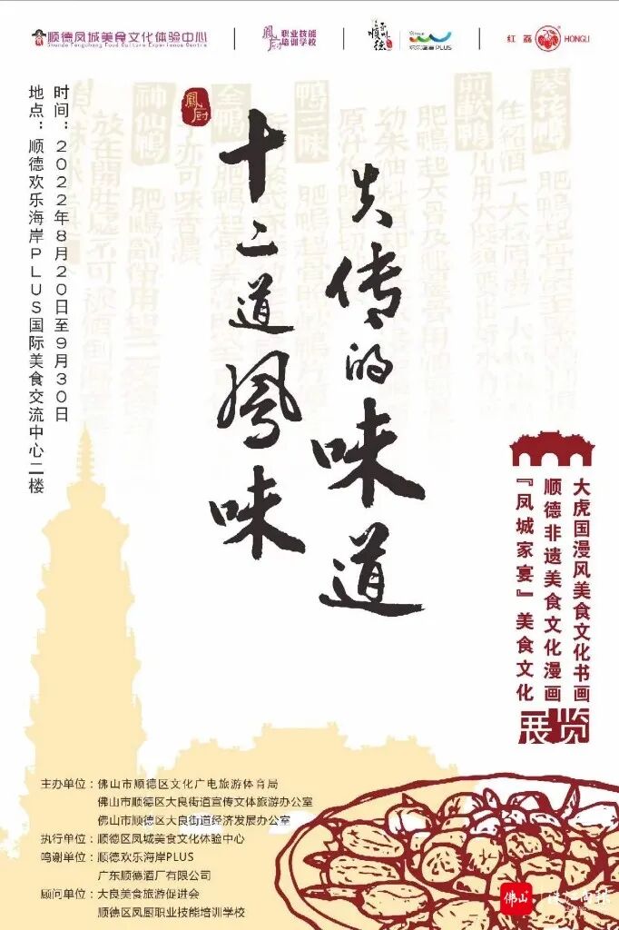 本次的顺德美食文化联展由顺德区文化广电旅游体育局、顺德区大良街道宣传文体旅游办公室、大良街道经济发展办公室主办,顺德区凤城美食文化体验中心承办,顺德欢乐海岸PLUS、广东顺德酒厂有限公司支持、大良美食旅游促进会和凤厨职业技能培训学校为顾问单位,把“十二道凤味,失传的味道”、“顺德非遗美食文化”、“大虎国漫风美食书画”三个美食文化符号完美的组合在一起,通过生动有趣的表现形式,把顺德美食的历史、文化、故事、制作技艺来一个大汇展,向市民和游客展现鲜为人知的顺德美食文化故事,三大展览将从8月20日持续到9月30日免费向市民游客开放参观。