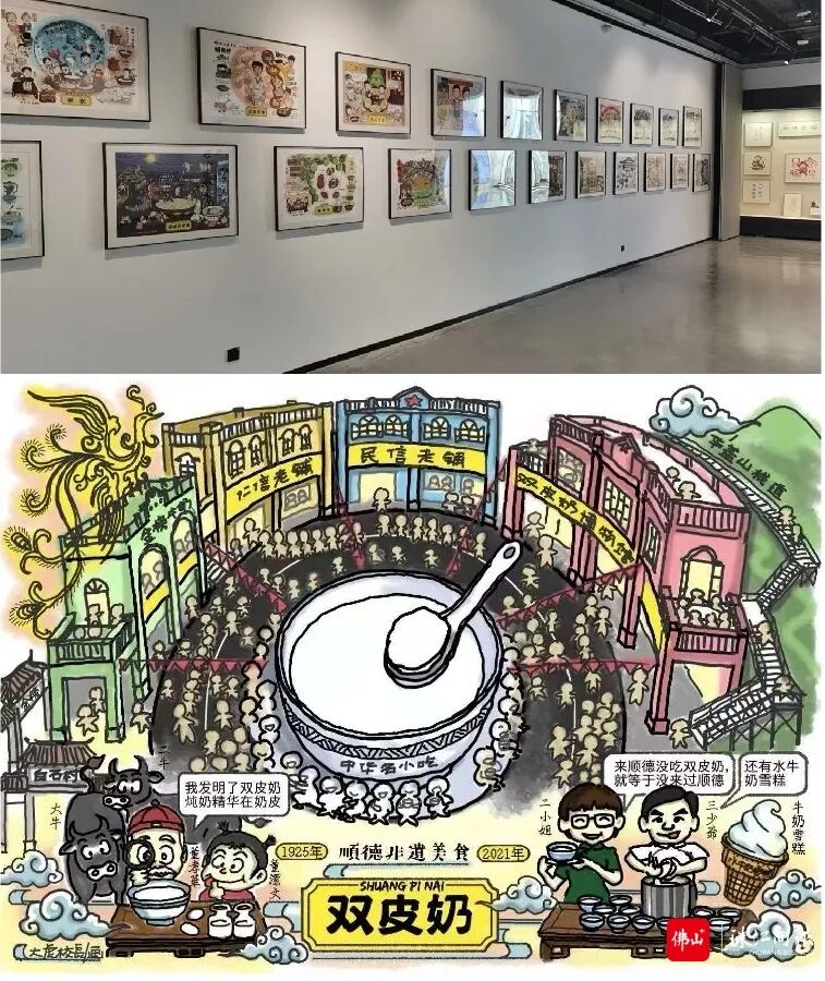 目前顺德拥有23项非遗美食,有大家熟知的双皮奶、伦教糕、陈村粉等,也有大家可能未见过甚至未吃过的美食,例如沙爆猪皮、栾茜粉等,不过没关系。因为顺德凤城美食文化体验中心的创始人大虎和顺德职业技术学院的两位大学生一起把这23项顺德非遗美食以漫画的形式画了出来,生动的表现了非遗美食的由来、发源地、制作技艺、传承人等元素,看过就能把顺德非遗美食了解透彻,23幅美食漫画彩色描绘,一字排开,场面十分震撼。目前,已有世纪小学、西山小学等多家学校发出邀请,希望该漫画展览走进校园,面向广大学生科普宣传。