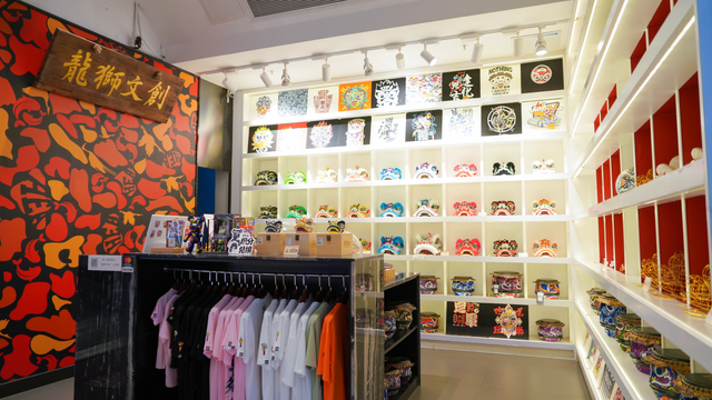 周皓晖:其实HEA所有的产品都是团队原创的。我们根据所感受到的岭南文化去做创作。我们的店面多数采用岭南建筑风格,青砖、木雕等都是围绕岭南文化来呈现。店里展示的狮子头,都是HEA专门邀请佛山做狮子头的老师傅重新扎作,再涂上HEA设计搭配的颜色,让狮子头看起来更动感更潮流。现在店铺展示的效果都很好的。