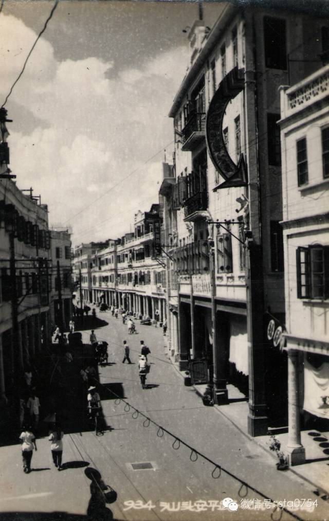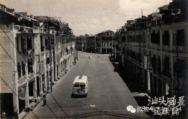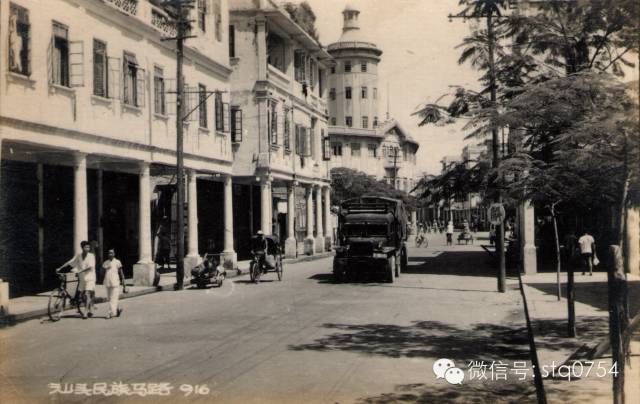 一九五〇年代的民族路。照片中圆柱形建筑为新加坡虎标万金油老板胡文虎和胡文豹兄弟于一九三三年在汕头所建的“永安堂制药厂”旧址。