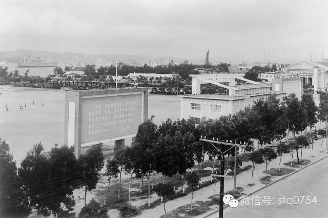 二十世纪七十年代前后的汕头市人民广场:广场北部中央设置主席台;两侧有大型毛主席语录牌;西面工人文化宫影剧院。