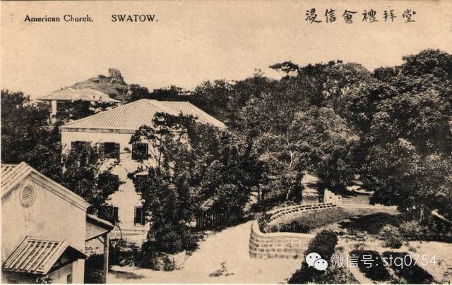 美国浸信会是战前在汕头进行传教活动的另一个外国宗教组织。图示浸信会建于礐石的会址,左下方为该会礼拜堂。一九一○年代明信片,汕头美璋照相印制。