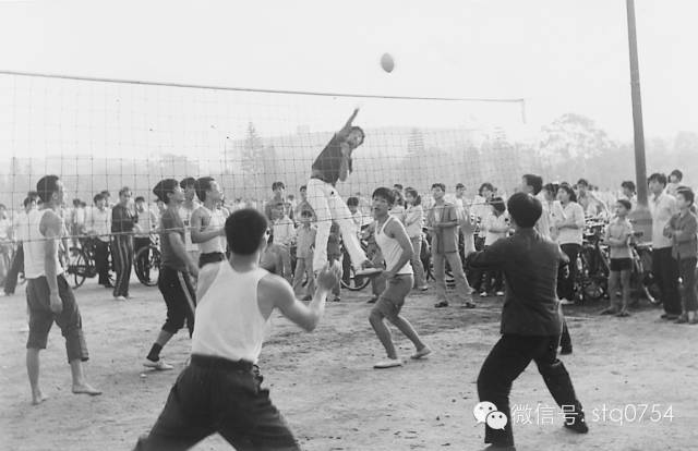 二十世纪八十年代的人民广场上,青年们正在进行体育活动——打排球。