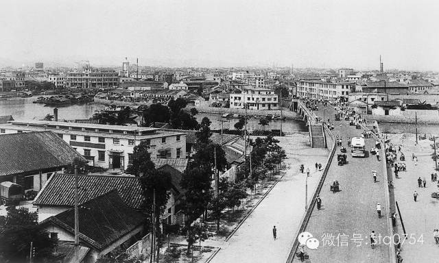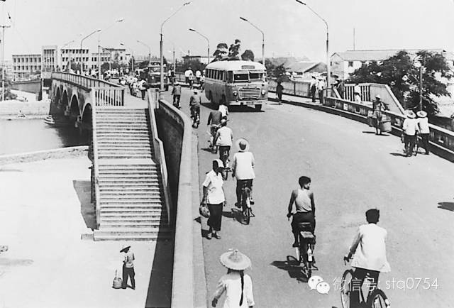 二十世纪七十年代从潮汕路杏花旅社楼顶眺望解放桥至老市区的景象。