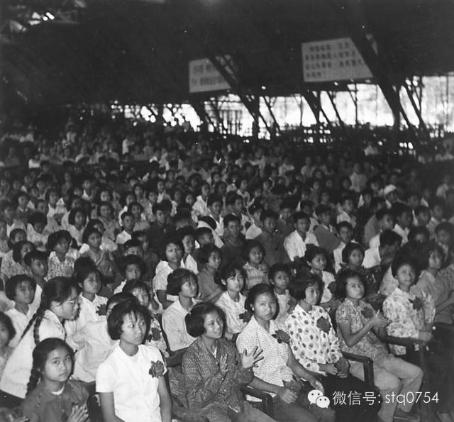 汕头市在中山公园大同戏院举行欢送知识青年上山下乡大会。图示大同竹篷棚戏院内,将要下乡海南的知青们胸挂红花,意气风发。摄于1965年