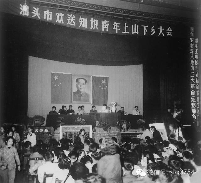 汕头市在中山公园大同戏院举行欢送知识青年上山下乡大会。图示欢送大会主席台。摄于1965年