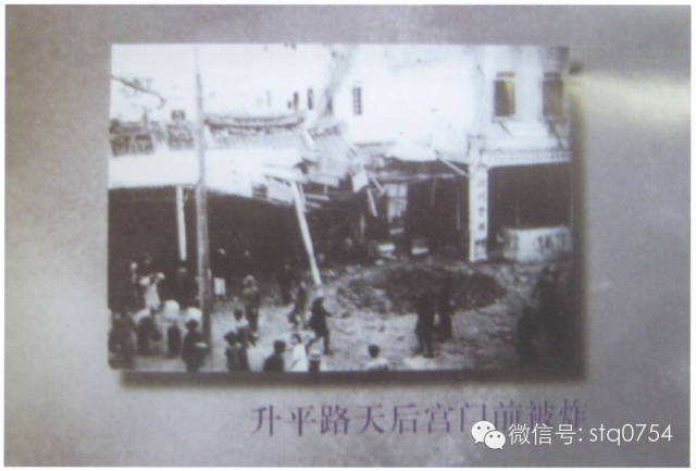 日军入侵汕头后,升平路天后宫前被炸场面。抗日战争时期1939年