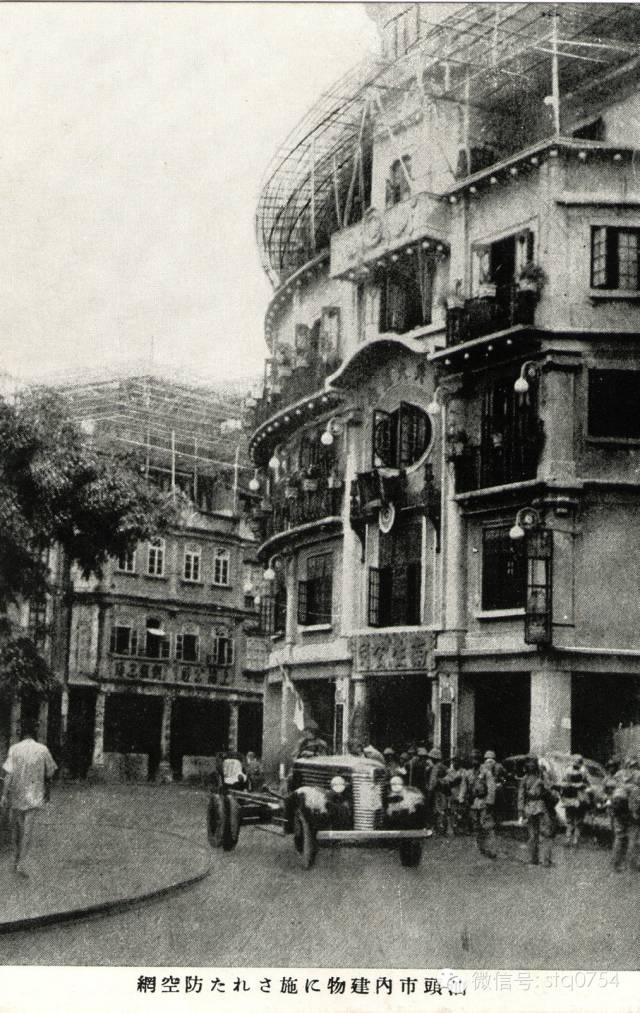 战时市内多幢建筑皆于屋顶上铺设防空网,右边大楼为当年小公园的南生公司(即后来的百货大楼)。属日军《汕头所见》系列明信片中一幅。日本名所图绘社印行于1940年代