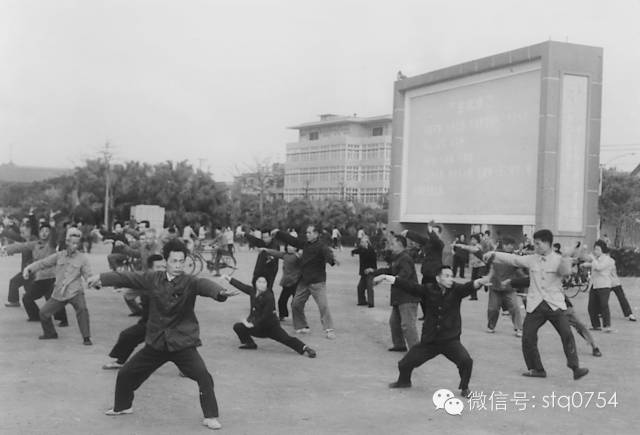 早晨,市民群众在人民广场主席台前打太极拳锻炼身体。摄于1980年