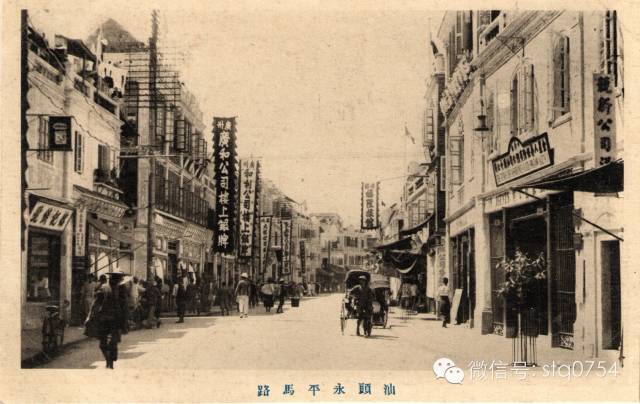一九二〇年代的永平路,但见商店林立,车水马龙,一派繁荣景像。日本明信片,出版者不详。图中注明“永平马路”。