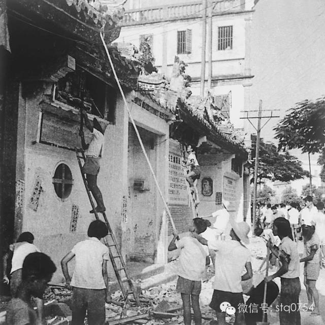 汕头存心善堂始建于清光绪二十五(公元1899年),是一组三座并列相连的庙堂式建筑,面积约2500平方米,是地方建筑传统艺术的结晶。在“文化大革命”时期遭受严重破坏,现原址仅存部分木雕、石刻。图示1966年8月,红卫兵破“四旧”捣毁存心善堂屋顶所谓“旧文化”工艺装饰。
