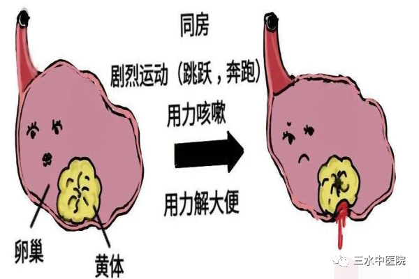 在月经来潮前一周,因黄体的囊壁非常薄,而内层又具有丰富的毛细血管网,所以非常容易破裂出血。当同房、攀岩等剧烈运动导致腹腔压力升高时,则容易发生黄体破裂。但是并不是所有的黄体破裂都需要手术治疗,轻微的破裂出血,黄体内的毛细血管会自动愈合而止血,通常这种腹痛症状比较轻,只需休息一会就没事了。