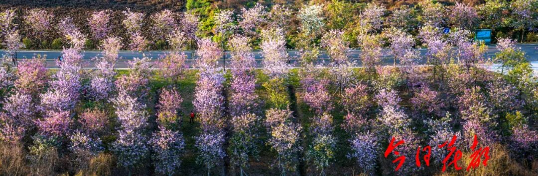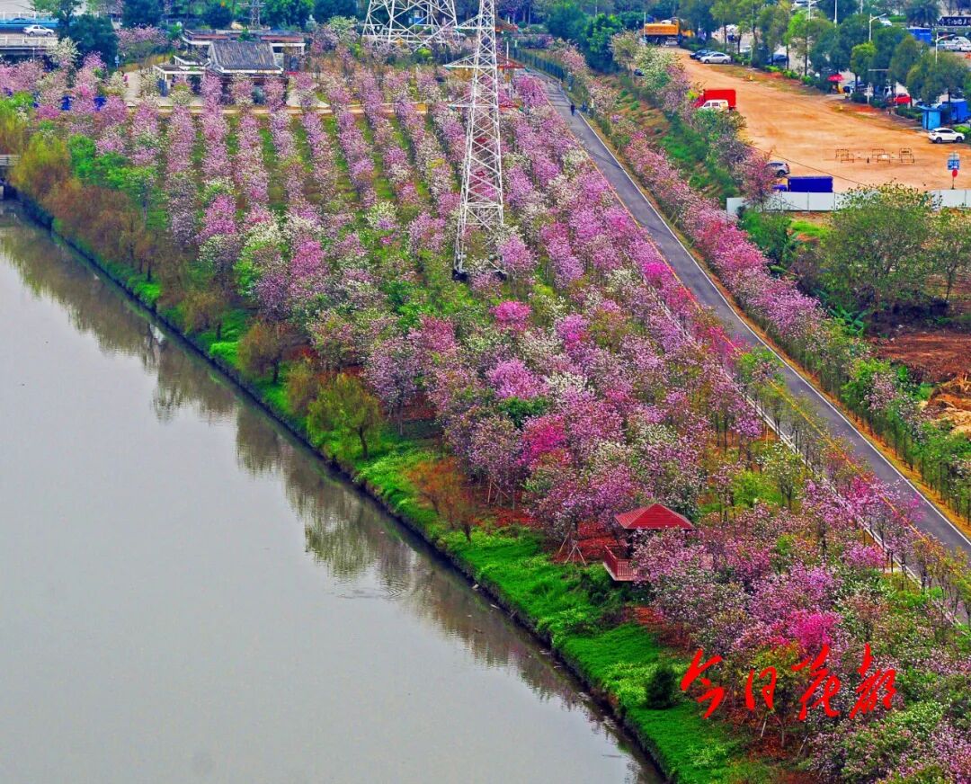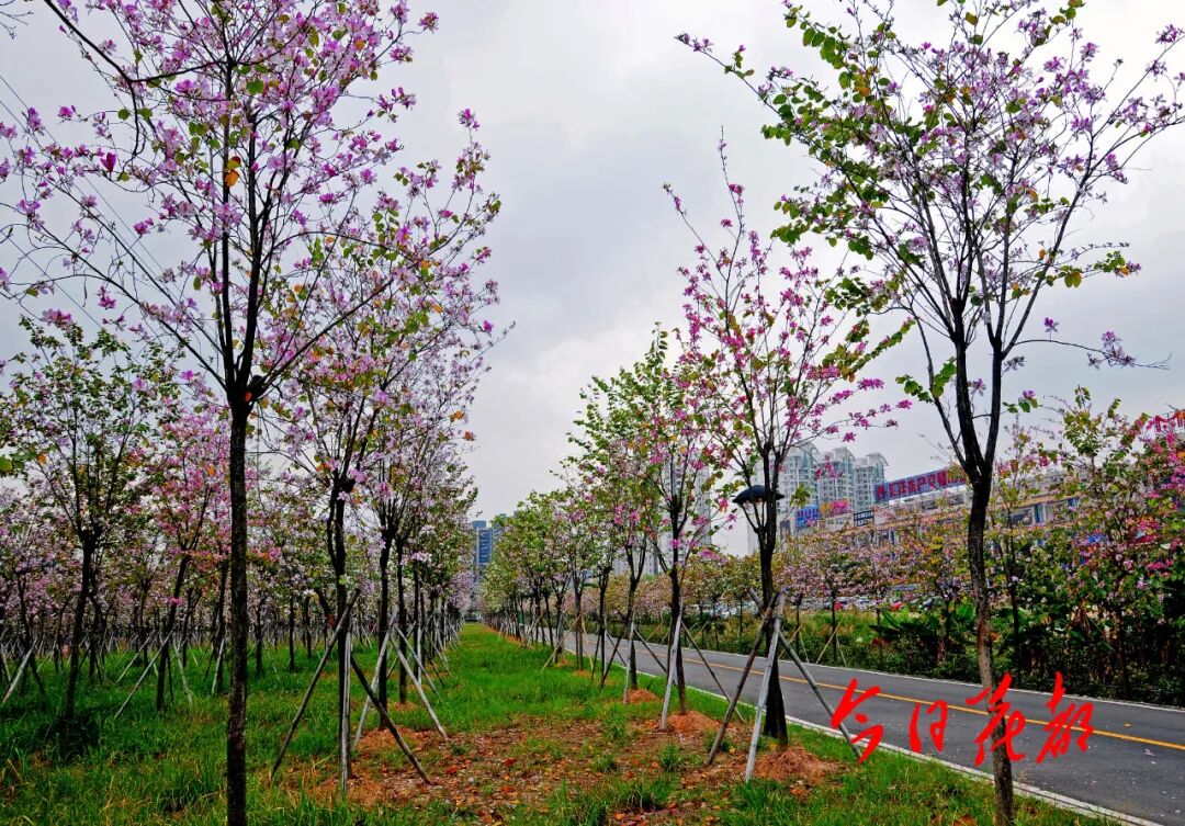 最令人震憾的要数宫粉紫荆花色地带:北起凤凰路南至迎宾桥,花都湖两岸连绵10公里,1万多株宫粉紫荆迎风摇曳、绚丽绽放,远远看去,紫云漫天、满城浪漫!