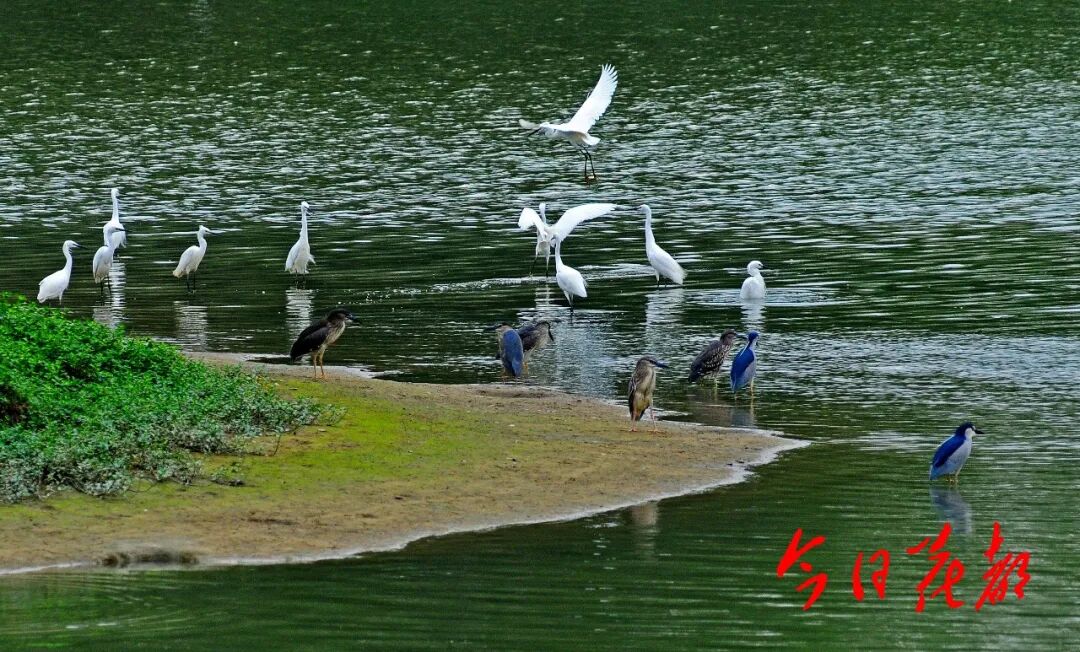 沐浴在暮色之中的花都湖国家湿地公园更是别具韵味:湖水与岸边构成的景致相映成趣;栈道与水域交织的景观美如诗画。水岸沼泽地,一群群准备归林的白鹭,时而低飞、时而徘徊,构成一幅“落霞与白鹜齐飞,秋水共长天一色”的美景。