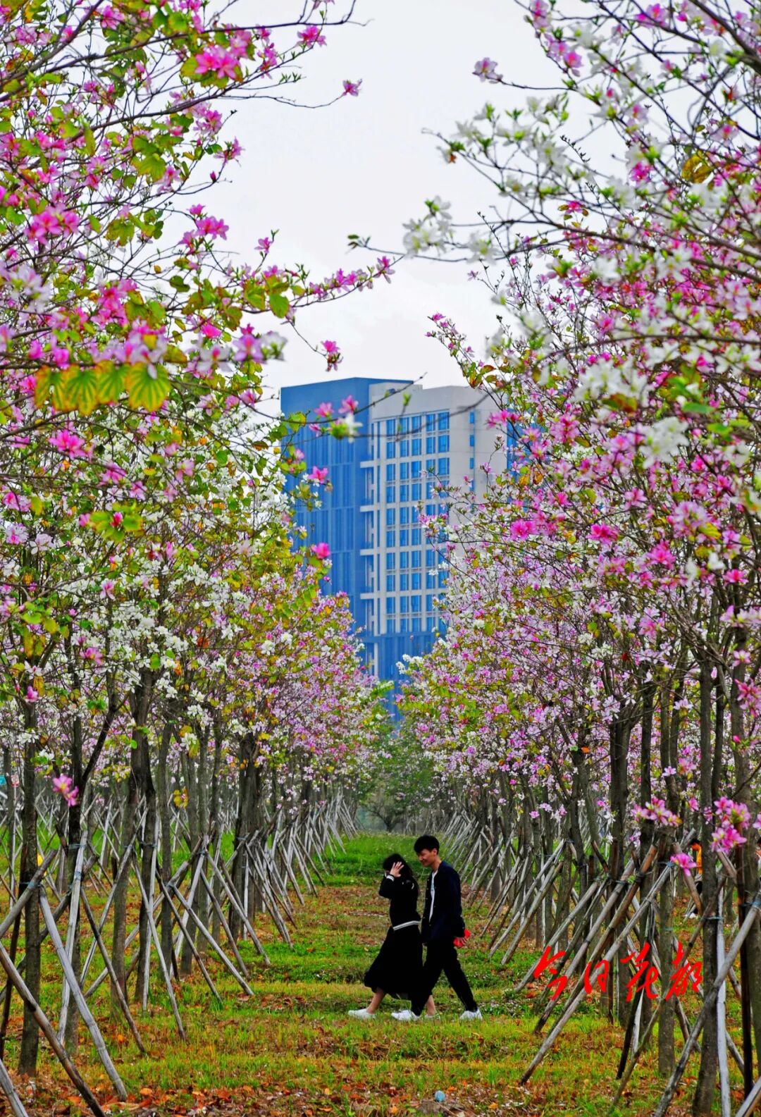 王影介绍,每到宫粉紫荆盛开的时候,花都湖人流如织,漫步花海中,仿佛置身于粉色的天堂!