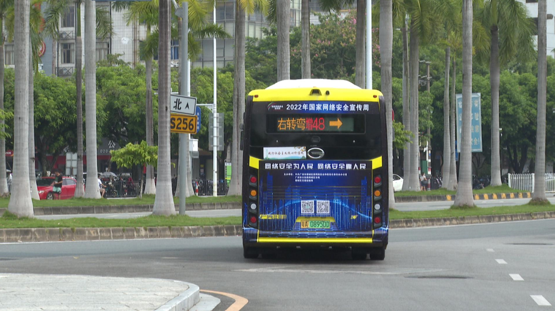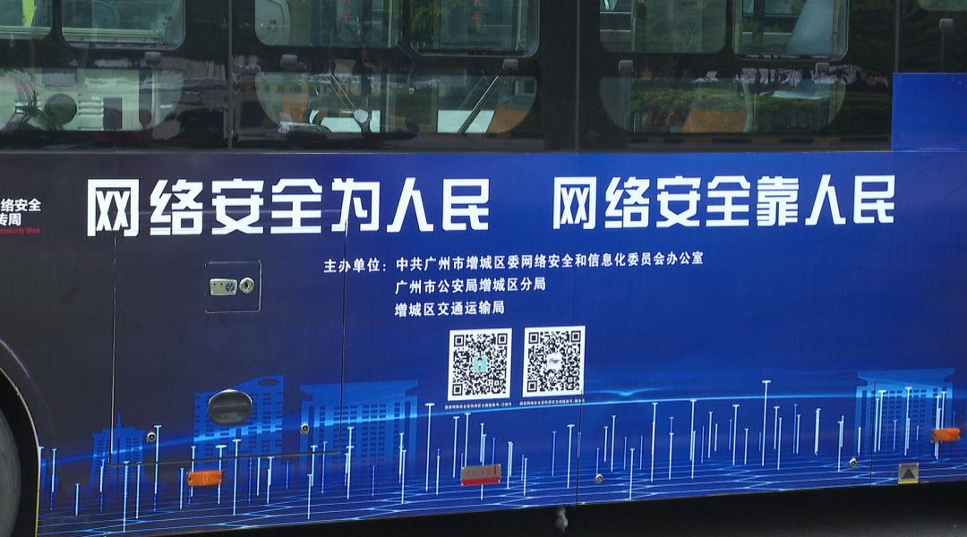 在增城广场公交车站可以看到,“增城网安号”公交车车身以醒目的蓝色为主,车身外侧印有“网络安全为人民 网络安全靠人民”“筑牢网络安全屏障 守好数据安全防线”等标语以及国家网络安全宣传周官方微信账号二维码等内容。