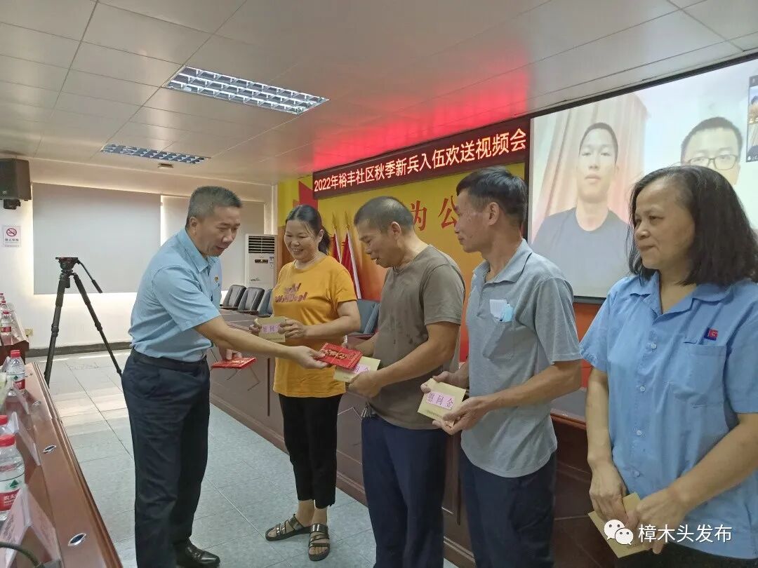 在裕丰社区,社区干部向入伍的两名新兵家属送上慰问金,并通过视频与两名新兵展开对话。