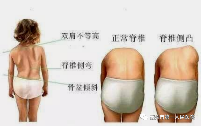 胡博士在这里教给家长们一个筛查和检查小孩是否存在脊柱侧弯的简单方法:让孩子脱去衣服,观察有没有高低肩,两肩是否在同一高度,如果出现一边偏高一边偏低就要怀疑是否是脊柱侧弯了。再让孩子向前弯腰,两边膝盖伸直,身体往前弯曲45~90度,双手往下垂直放松;家长站在孩子的后方,观察孩子肩膀、肩胛(背部)、腰部有没有出现不对称的状况,如果孩子脊柱侧弯,可以很明显看到背部有一边特别高,或是歪斜(如下图,图片自网络)。如有怀疑,则请尽快带小孩就医。