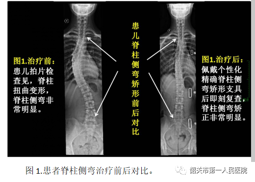 陈女士无意中发现12岁的女儿姿势不端正,两个肩膀一边高一边低,怎么提醒注意都没有用,于是带着女儿来到市一医院骨科就诊。创伤足踝外科主任胡争波博士详细询问了病情、体格检查并拍摄脊柱全长正侧位片(下图1,治疗前),初步诊断为青少年特发性脊柱侧弯。