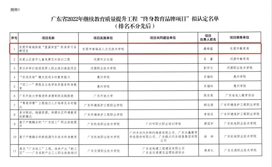 近日,广东省教育厅公布了2022年广东继续教育质量提升工程“终身教育品牌项目”和“全民学习之星”的认定名单,由东莞市教育局推荐、南城教育管理中心指导、南城成人文化技术学校实施的“篁溪学堂”终身学习品牌项目成功入选。
