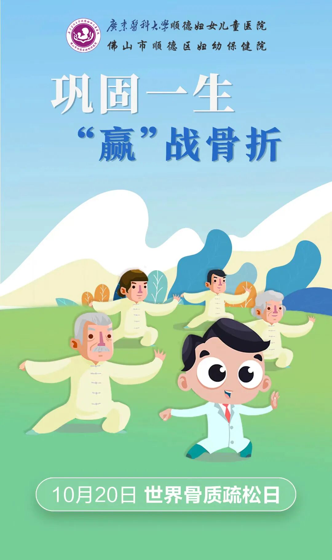世界卫生组织将每年10月20日定为“世界骨质疏松日”,今年世界骨质疏松日中国主题为:“巩固一生,赢战骨折”,旨在普及骨质疏松症防治相关知识,呼吁每个人积极参与维护自身骨骼健康,采取健康生活方式,为骨骼健康投资。