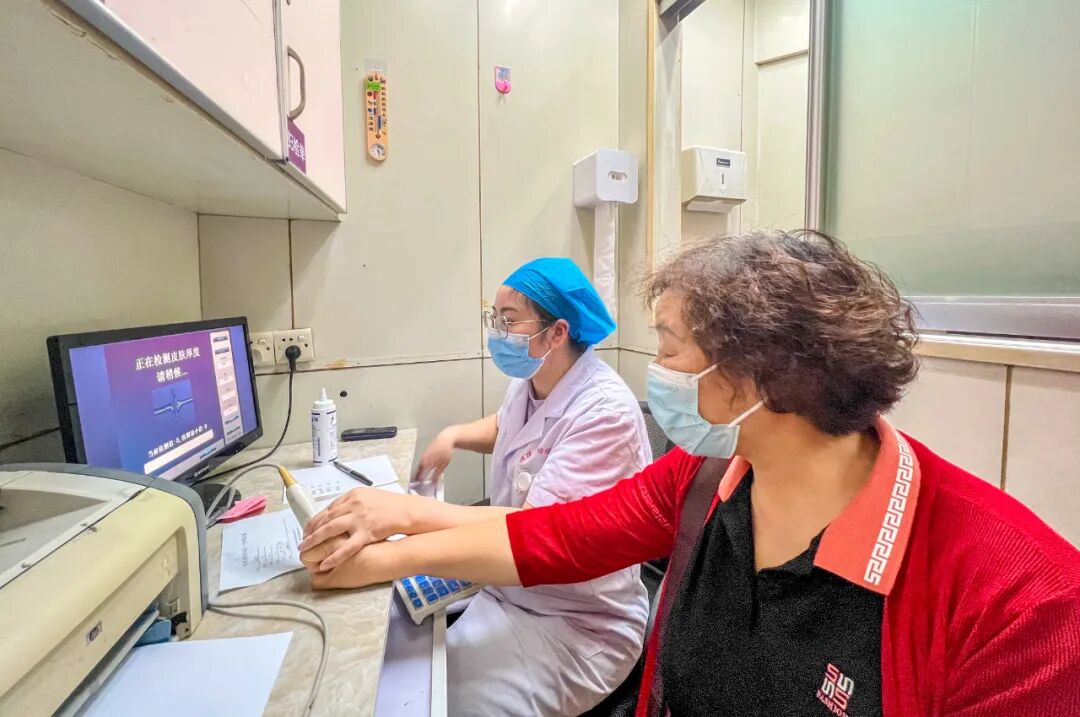 护士为前来参加义诊的市民做骨质疏松检测