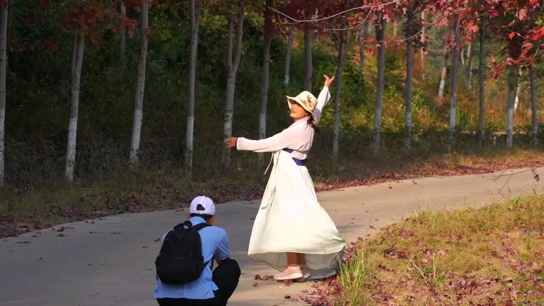 从广州自驾过来游玩的冯女士,特意换上了应景的汉服,观赏枫叶、打卡拍照,感受秋日的惬意和浪漫。