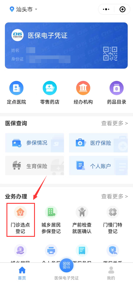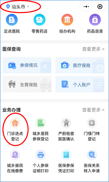 1. 进入“粤医保”小程序,主页登录后在“业务办理”处,选择“门诊选点登记”。