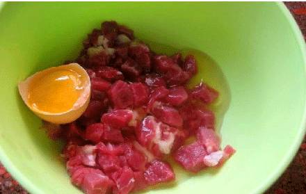 4、鲜肉拌上鸡蛋炒熟留用(ps:其实具体要下什么可以自己随意安排,这个没什么统一的标准,喜欢什么就下什么,自由发挥。味道不同的最好不要混一起炒,比如肉和虾,鲜虾搭配萝卜口感也不错哦!)