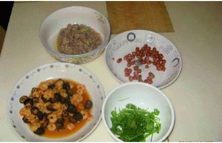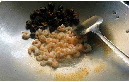 3、虾仁香菇炒熟留用,先调好味道