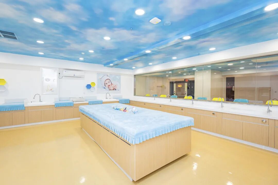 婴儿室配有新风系统、洗澡台、按摩抚触操作台、游泳池、新生儿视听训练及视频监控系统,产妇在房间休息也可以随时看到新生儿动态,消除母婴分离焦虑。