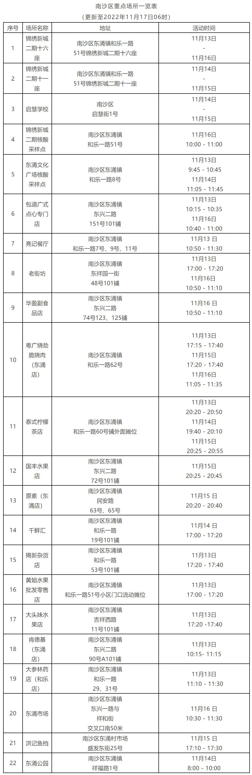 因新冠疫情防控需要,请在相关时段到过南沙区下述重点场所的人员,立即向所在社区(村)联系报备,严格落实“3天3检”,同时配合社区(村)和疾控部门要求做好健康管理。若不如实申报,不落实防控措施,造成严重后果的,将承担相应法律责任。