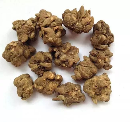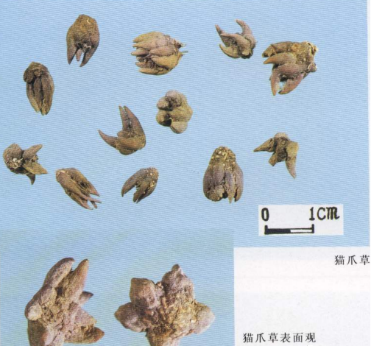 本品呈纺锤形,多5~6个簇生,形似猫爪,长3~10mm,直径2~3mm,顶端有黄褐色残茎或茎痕。表面黄褐色或灰黄色,久存色泽变深,微有纵皱纹,并有点状须根痕和残留须根。质坚实,断面类白色或黄白色,空心或实心,粉性。