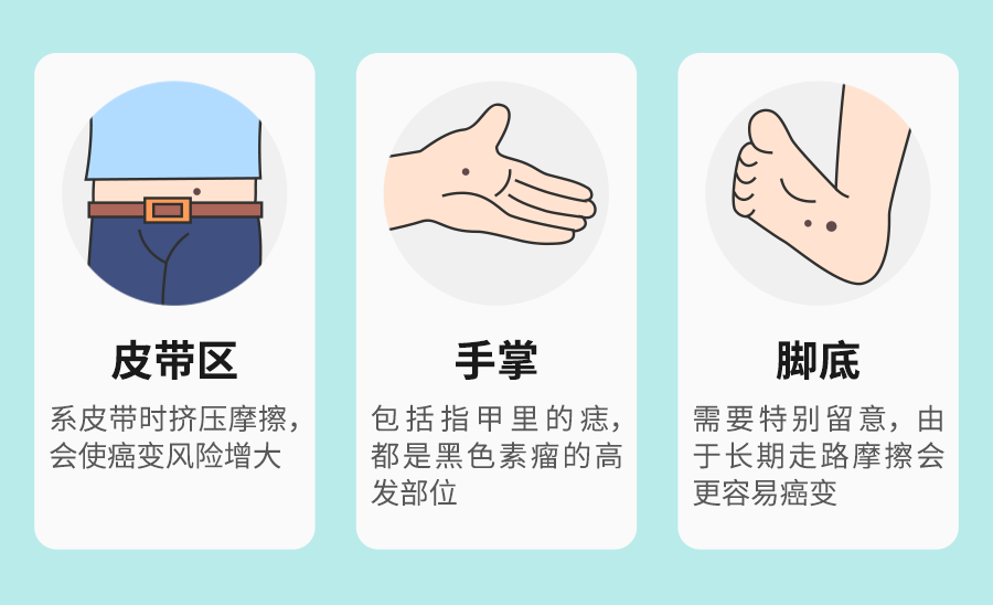 长在手掌、脚掌、头皮、腰部的痣,要特别留意,它们容易受摩擦刺激,时间长了恶变可能性增大。长在这些部位的痣,一般建议手术切除。