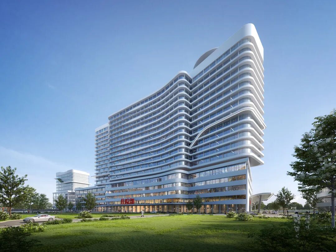 新院区依托水系廊道、空间通廊,打造多维度多层次空间绿化体系,构造生态网络格局,将场地绿化环境与绿岛湖片区的空间结构有机联系起来。将代表勃勃生机的自然元素引入到室内空间是本项目的另一大特点,建筑顶部的自然天光,使穿插在公共空间的绿色景观得以健康生长。方案在设计中呼应项目场地及周边地形地貌,采用集约式布局,以“一轴串两带”为规划策略,最大化挖掘土地潜力;医疗功能紧凑集中、环境舒适、流线便捷。新院区周边水系环绕,设计单位从独特的河涌环境特色和传统龙舟文化中提取“龙舟·水”的概念,作为形体及造型设计的核心理念,通过丰富的水岸环境、一气呵成的流线型建筑形体,打造“水岸龙舟”的具有鲜明特色的医疗建筑形态。