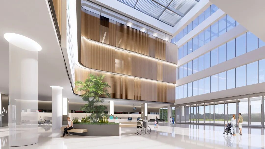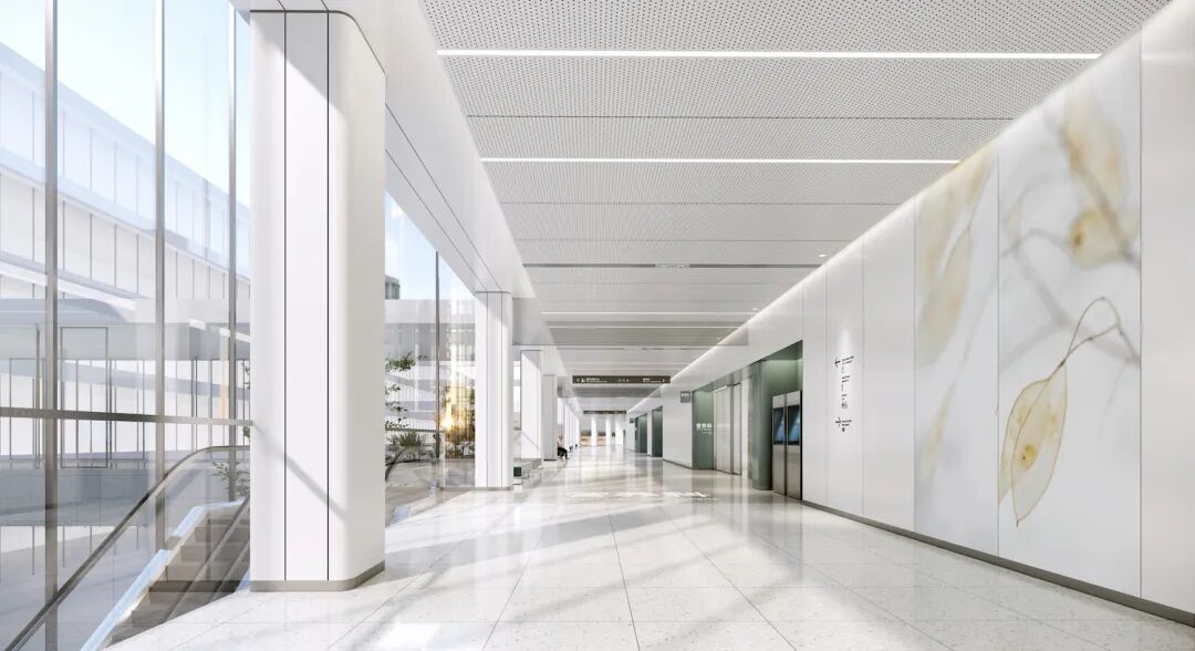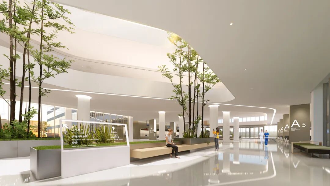 “双首层人车分流”的交通动线设计——“车行地下、人行地上”,地下一层设计循环、分区式落客系统,“生态谷”的设计概念,将“立体人车分流系统”与自然融为一体,把更多的自然光与生机带到室内,创造出舒适宜人的就医环境,提升了医院整体的就医体验。