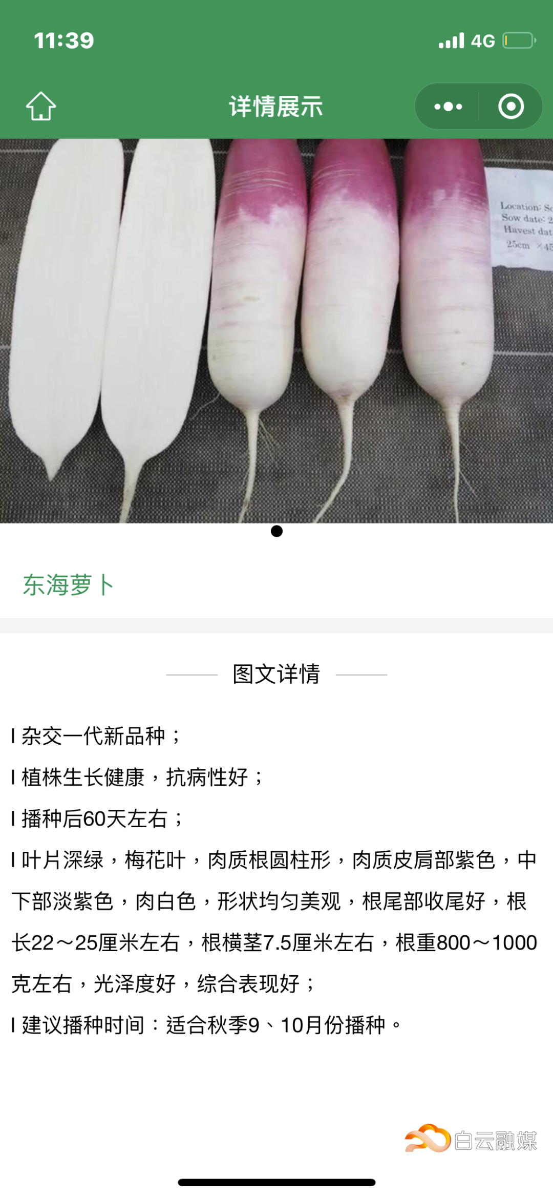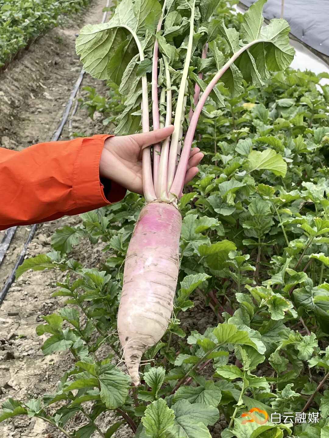 与市场上常见的白萝卜不同,东海萝卜作为杂交一代新品种,成熟后表皮呈淡紫色,肉白色,光泽度好,其植株生长健康,抗病性好,既可生吃也可入菜。播种后60天左右即可成熟,亩产产量高达1-2万斤,适合在秋季9、10月份种植。