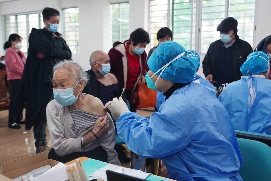 “是谢福吗?今年95岁?近期身体有无不适用药?有什么慢性疾病吗?以前打疫苗有无过敏情况发生?”医护人员认真细致地核实老人的个人信息以及身体状况,确认无误后,拿出了疫苗。老人在家人协助下脱下外衣,露出左臂,十秒钟不到,就完成了第一针新冠病毒疫苗的接种。
