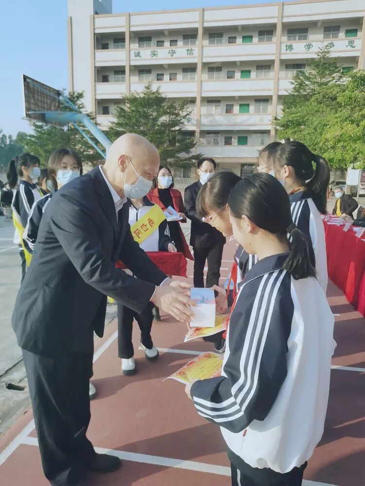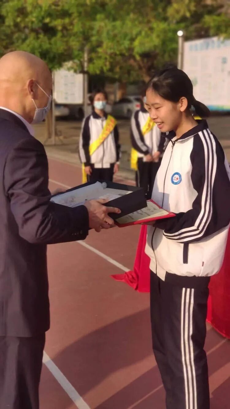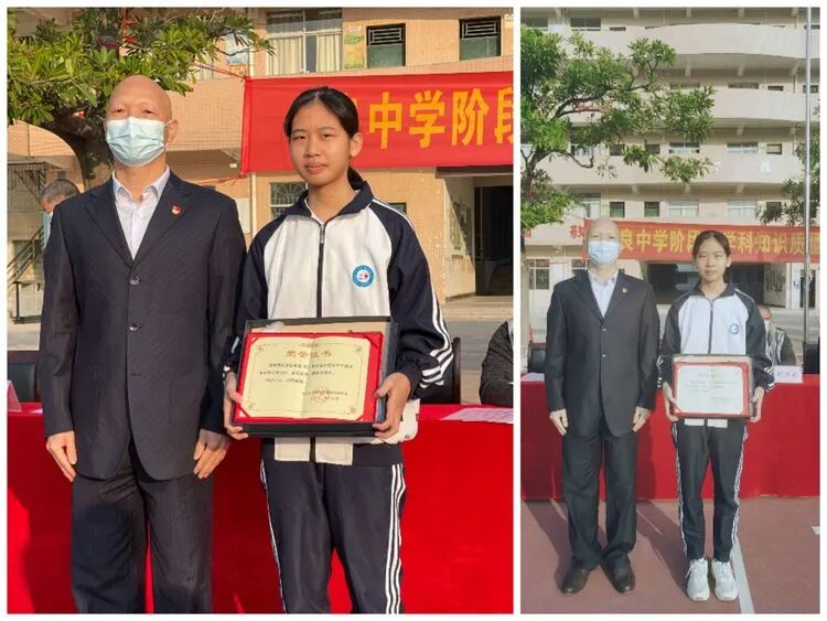 李用敏校长为2021年度茂名市语文素养展评活动三等奖获得者、2022年电白区好少年梁锦芳同学颁奖。
