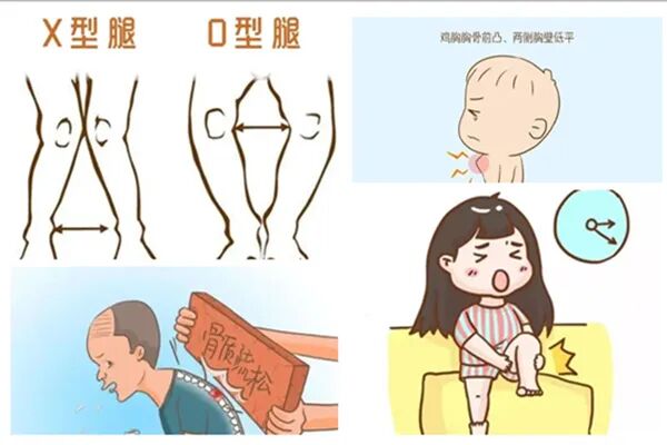钙广泛参与骨骼、肌肉、心血管、凝血等系统的功能。小儿缺钙,容易导致X型腿或者O型腿、鸡胸、漏斗胸、智力发育迟、学步晚、牙齿排列稀疏、头发稀疏、佝偻病等。成人缺钙,易导致骨质疏松、易发生骨折、低钙血症、抽筋、腰酸背痛、易过敏等。中老年人缺乏会影响其肌力和身体的稳定性,使老人容易跌倒,还会导致骨量减少、骨质疏松、易骨折等问题。
